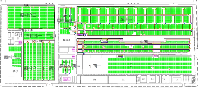 本工程总装机容量为40MWp,交流侧最大输出功率32.872MW,综合系统效率为82%。各个光伏子方阵单元采用组串式逆变方案,光伏并网电站系统由6个发电单元构成,其中安装72081 块555Wp高效单晶硅组件,安装300kW/1500V逆变器105台,196kW/1500V逆变器7台。每台逆变器输出电压为800V三相交流电,通过断路器接到升压变压器的一个低压绕组上,经2000kVA、2500kVA箱式变压器升压至10kV高压,本项目分为十五个光伏发电子系统,6个并网点,每个发电单元由1~3台干式变压器及5~9台 300kW,1~3台196kW组串式逆变器组成,经10kV集电线路并联后,通过高压开关柜分别接入厂区配电房的10kV母线段上,再经过110kV欧神诺变电站输送至公共电网上实现并网。厂区屋面情况如下: